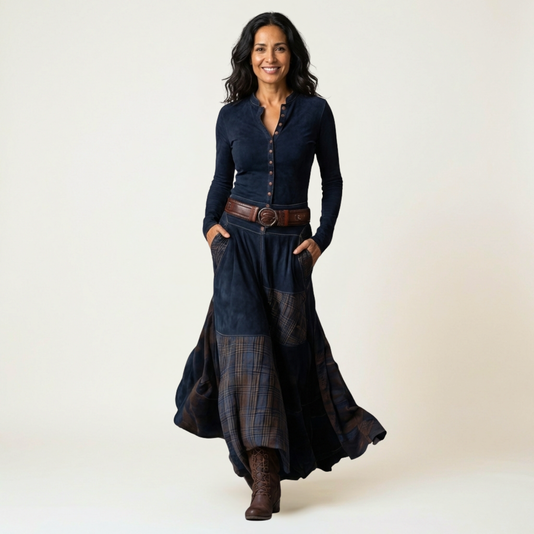El vestido Sofia combina la fuerza del estilo vintage con una elegancia bohemia atemporal. Confeccionado en ante ecológico azul marino y paneles de cuadros en tonos tierra, esta pieza une texturas y movimiento en un diseño que destaca por su carácter artesanal.